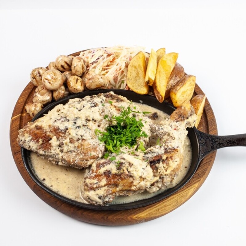 Ще одна новинка – це вогняна курка, адже відтепер її готують на грузинський манер, тушкуючи у вершково-часничному соусі. Традиційно подається з печерицями, легким салатом та печеною картоплею.