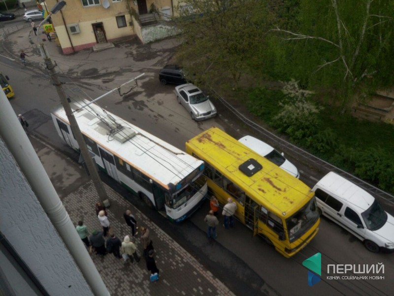 Сьогодні, 24 квітня, на вулиці Богдана Хмельницького у Луцьку сталася аварія. Тролейбус та маршрутка «не поділили» проїжджу частину.