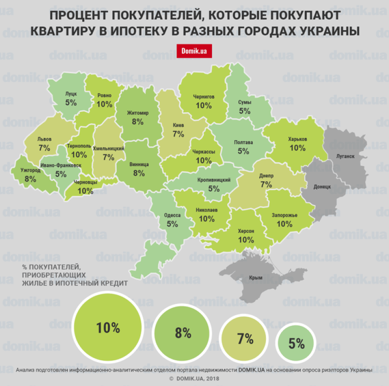 Редакція порталу Domik.ua провела опитування серед професійних ріелторів щоб дізнатися, скільки покупців користується іпотекою при купівлі квартири на первинному і вторинному ринках нерухомості в різних містах України.