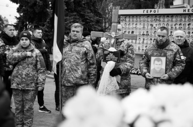 Після завершення богослужіння домовину з тілом покійного захисника пронесли Театральним майданом. Біля пам’ятного фотостенда загиблим Героям траурна процесія зупинилися і виконала Державний Гімн.