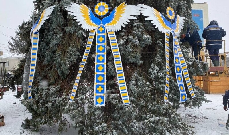 На нижньому ярусі ялинкового тріо комунальники розміщують 12 янголів, які виконані в національних кольорах. Вони символізують пам'ять про загиблих у війні з росією українців.