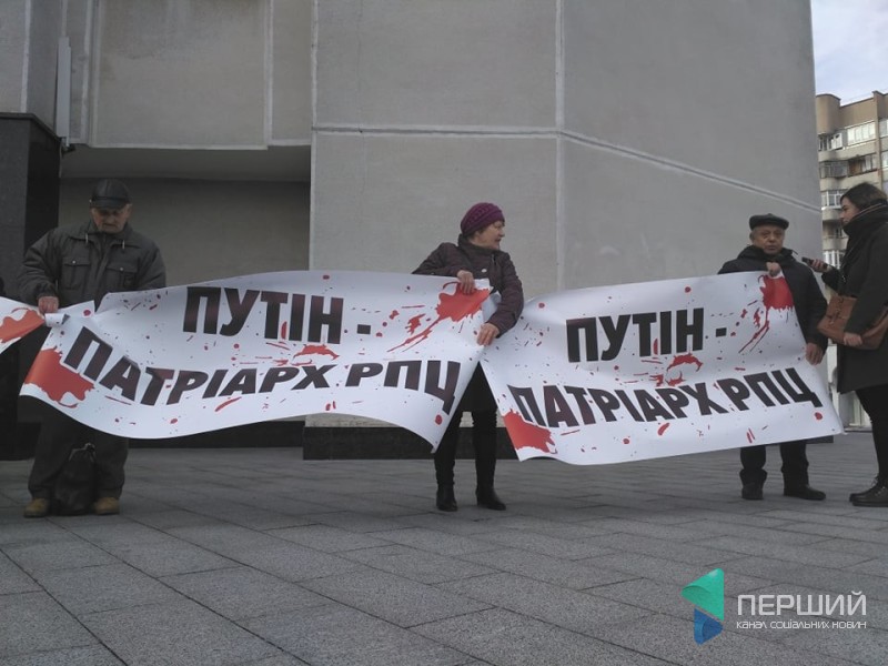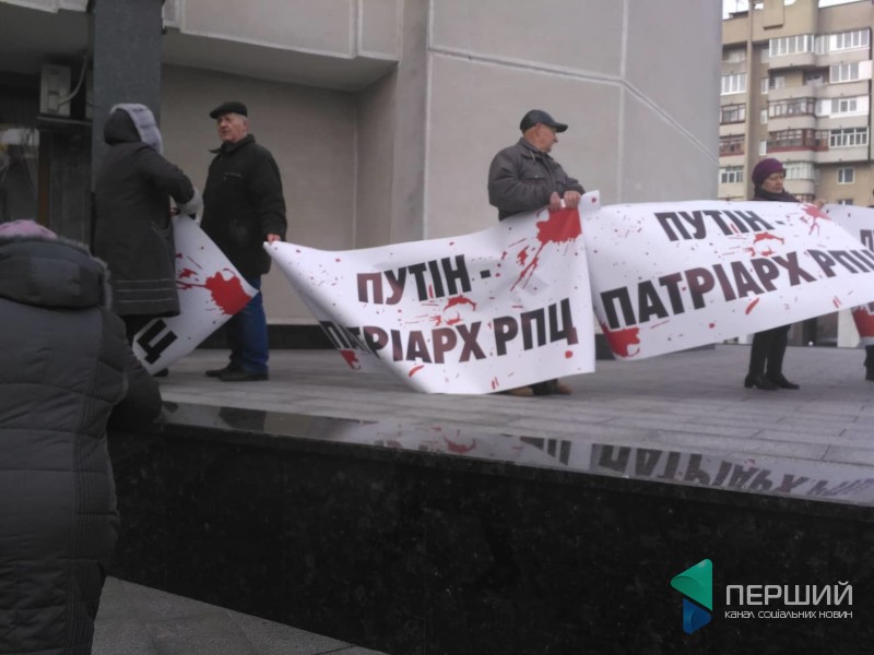 У Луцьку на акції протесту прихильників УПЦ МП розгорнули плакат з написом «Путін патріарх РПЦ».
