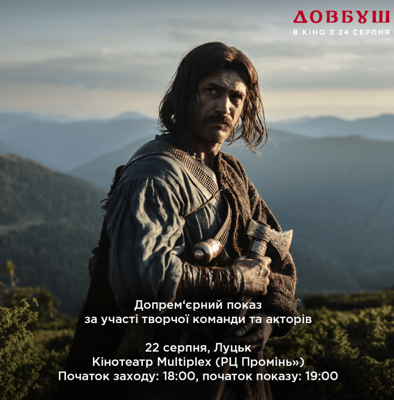 22 серпня в Луцьку відбудеться допрем’єрний показ українського художнього повнометражного фільму «Довбуш». Напередодні старту прокату в Україні фільм у Луцьку представлятимуть його творці: відомий український режисер Олесь Санін, продюсер Максим Асадчий, виконавець головної чоловічої ролі Сергій Стрельников та інші.