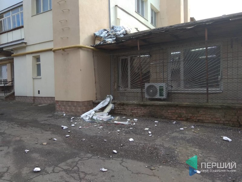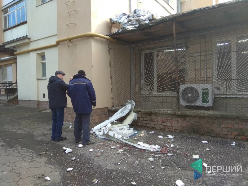 У Луцьку сильний вітер зірвав частину фасаду з будинку із годинником, що знаходиться у самому центрі міста, на Театральному майдані, більш відомому серед лучан, як «Бім-Бом».