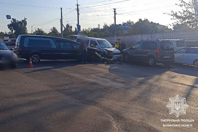 ДТП сталася на вулиці Глушець близько 8-ї години. Патрульні, які прибули на місце події, з’ясували, що водій похоронного катафалка Volvo не виконав вимоги дорожнього знаку 2.1 "Дати дорогу" та здійснив виїзд на перехрестя. Там він зіткнувся з автомобілем марки Ford, що рухався головною дорогою. А це авто, своєю чергою, вилетіло на зустрічну смугу руху та зіткнулося з легковиком Peugeot.