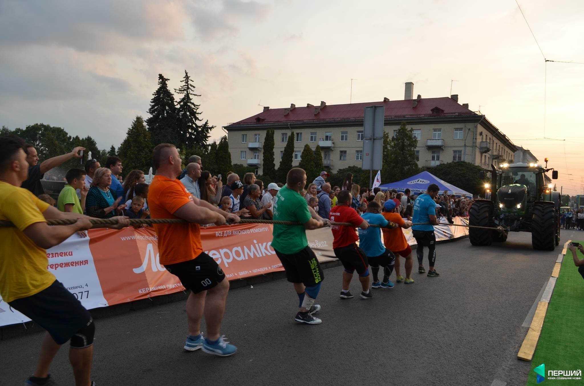 Чоловікам довелося тягати 8-тонну вантажівку, перекидати залізний «палець» вагою у 300 кілограмів, перекочувати надважкі покришки… Завершальним змаганням стало тягання легкового автомобіля у парі.