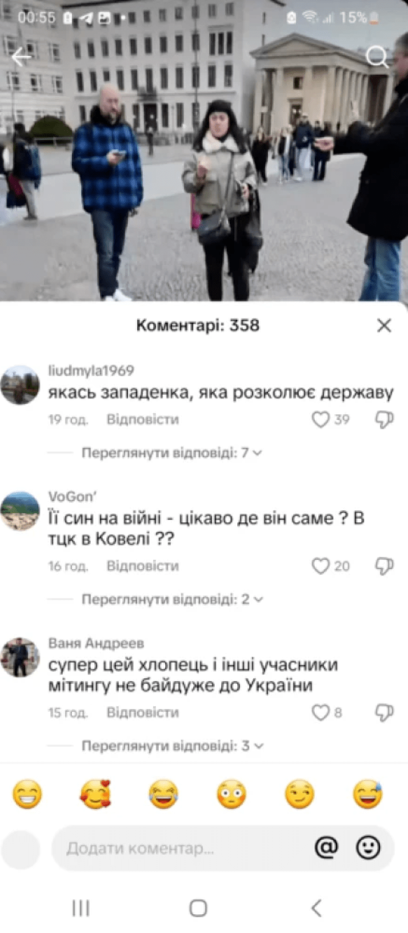 Після слів «не надо захищати на передовій буцімто якусь там Україну», «а всіх їх у раді перестріляти разом із Зеленським», «бо то він зробив, щоб війна тривала» від однієї з цих пропагандисток Ольга просто емоційно зірвалася.