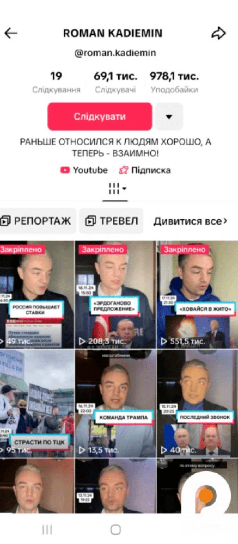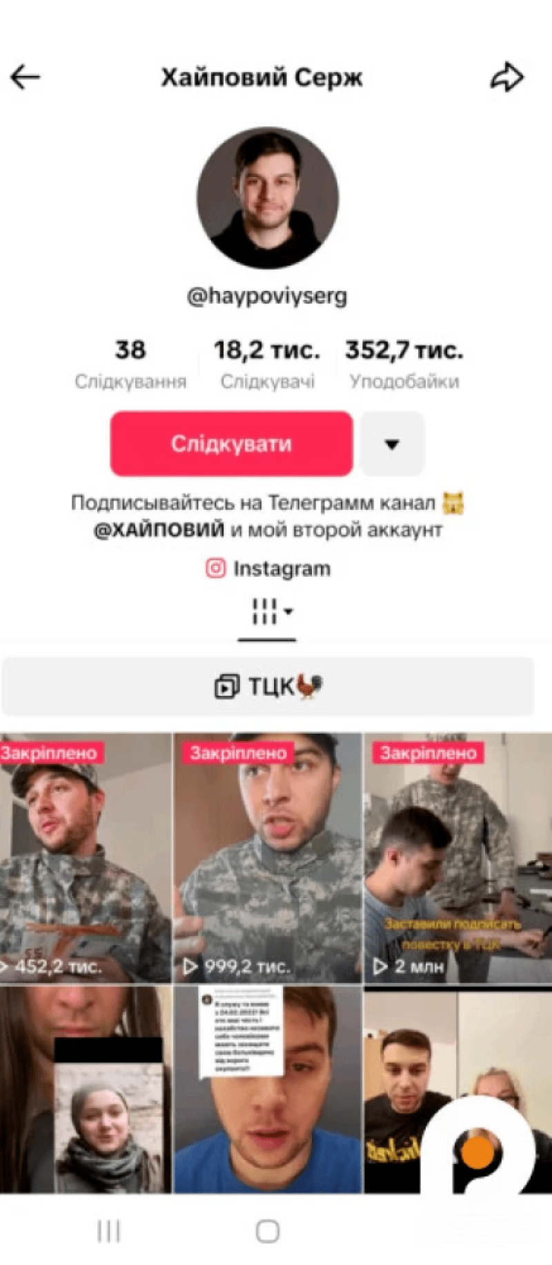 Той «хайповий» має два акаути у тік-тоці. Обидва – однаково огидні рупори вкидів та ворожих наративів. Молодик навіть знімає свої пропагандистські ролики у формі-піксель, у якій нас боронять наші захисники та захисниці.
