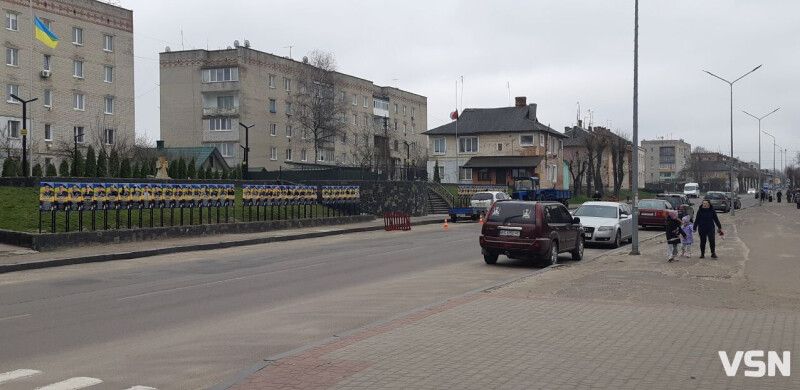 У місті Рожище біля скверу, де розташований пам’ятний знак за волю та незалежність України, встановлюють банери з портретами військових у боях за Україну.
