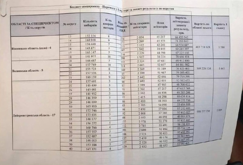 Генпрокурор заявив: за висновком експертів СБУ, на скупку голосів по всій Україні цій організації було виділено близько 80 млн доларів, але був ще й «спецпроект» для перемоги у 1-му турі виборів у трьох областях: «Вінницька область – 6 округів, Волинська область – 5 округів, Дніпропетровська область 17 округів».
