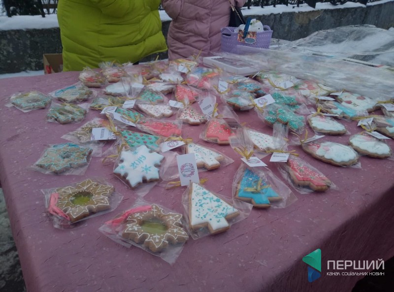 Біля собору продають різдвяне печиво. Від 20-40 грн за штуку. 150-180 гривень просять за набір.