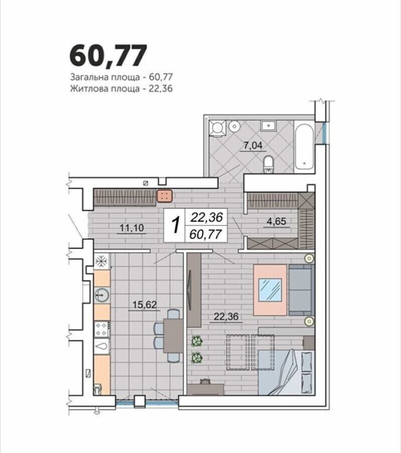 Житлова площа - 36,44 м2, де спальня і вітальня мають по 18,22 м2. У квартирі є також велика кухня - 15,48 м2, розділені санвузли та коридор. До речі, у кухні та санвузлах обладнана тепла підлога.