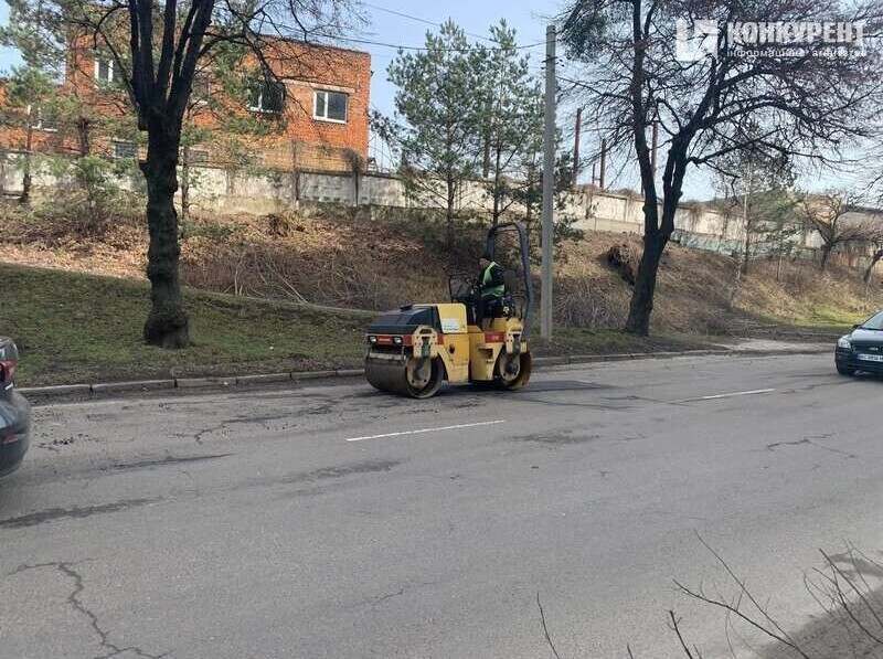 Спеціальна техніка займає усю праву смугу для проїду транспортних засобів. Комунальники в той час розгрібають та втрамбовують асфальтну суміш. За словами очевидців дорогу почали латати у вівторок, 14 березня, зранку.