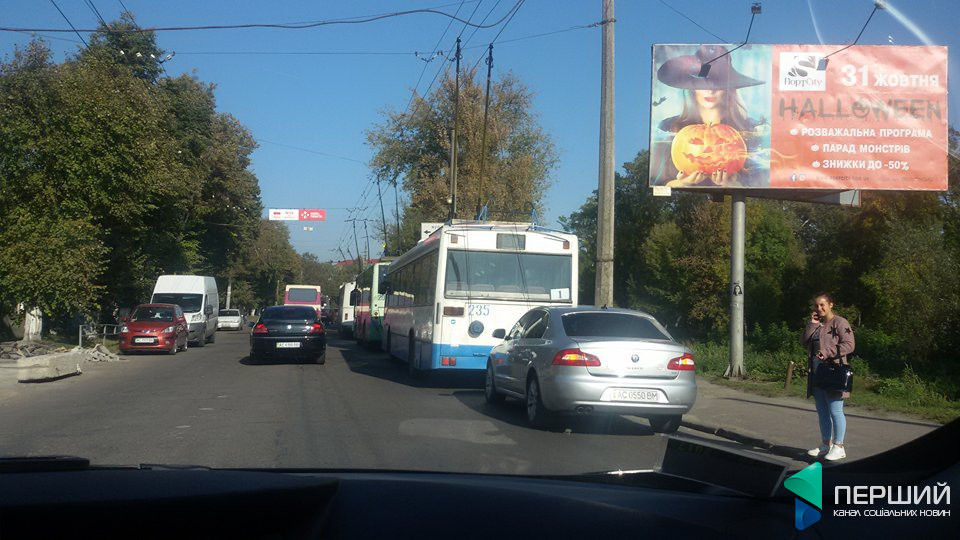 У центрі Луцька стоять тролейбуси. Поблизу Старого ринку вулицею Глушець через це утворився затор.