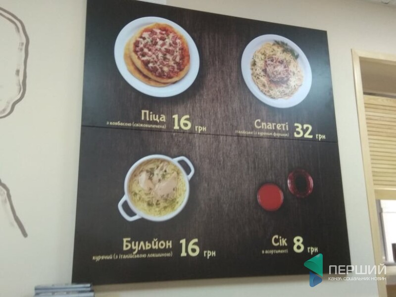 В меню – три страви: піца з томатним соусом і ковбасою (16 гривень за 140 грам), спагеті з курячим фаршем (32 гривні) та курячий бульйон (16 гривень). Представник закладу запевняє, що макарони – італійські з твердих сортів пшениці. Томатний і фруктовий соки коштують 8 гривень за склянку.