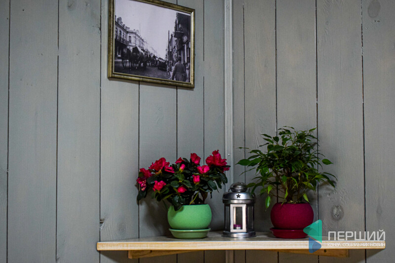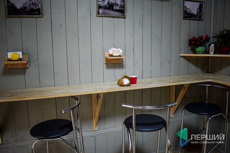 Приміщення невелике, однак пончики можна не тільки купити «з собою», а й з’їсти на місці. Для цього тут розмістили «барну» стійку і високі стільці. Інтер’єр прикрасили старими фото Луцька.