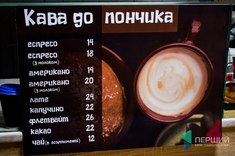 Еспресо коштує 14 гривень, американо з молоком – 20, капучино і какао – 22, імбирний чай – 18 гривень. Якщо купувати каву разом з пончиком, на напій діятиме знижка 20%.