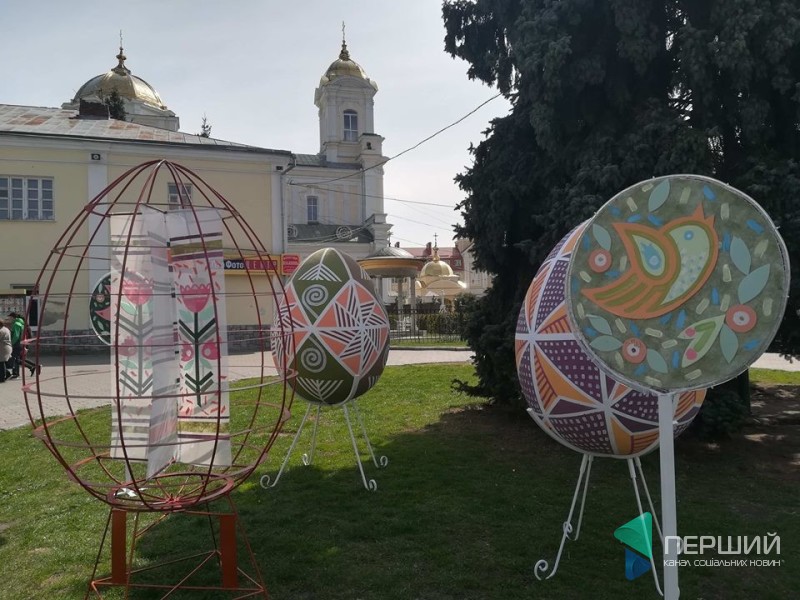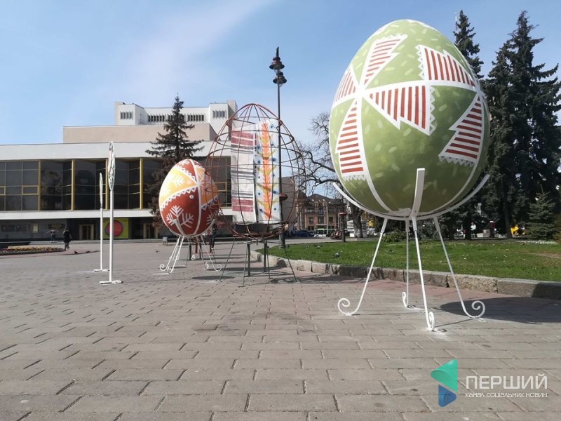 У Луцьку на Театральному майдані встановили яскраві великі писанки, а також конструкції із декором на пасхально-весняну тематику.