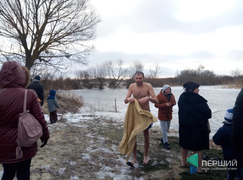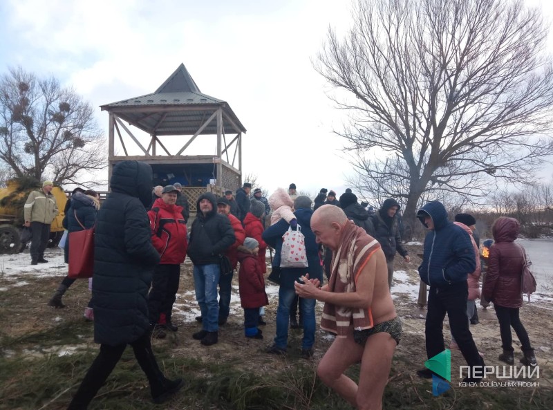 Частина людей вже пірнули, втім, більшість все ж чекають на хресну ходу із церкви, коли священик освятить воду. Чимало людей прийшли до річки разом із дітьми.