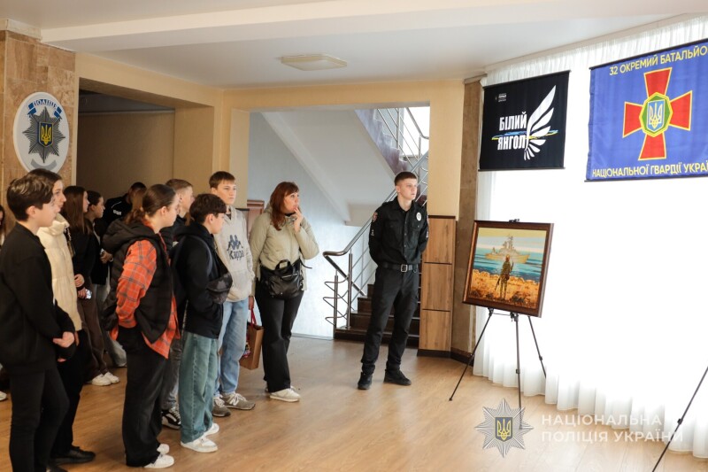 У фойє ГУНП співробітники кадрового забезпечення розповіли дітям про ту ціну, яку платять і наші колеги за право жити мирно на рідній землі: тут є стенд з світлинами загиблих, тож правоохоронці поділились їх героїчними історіями. Також у холі, за ініціативи начальника ГУНП, вивішена колекція прапорів поліцейських спецпідрозділів та їх бойових побратимів, є зразки техніки, яку застосовують в зоні бойових дій, символічні картини. Є тут і прапор так званих «білих янголів» - поліцейських, які евакуйовують людей з фронтових зон, ризикуючи власним життям.