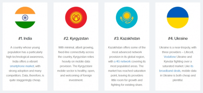 Україна потрапила до переліку країн із найдешевшим мобільним Інтернетом, зайнявши четверте місце після Індії, Киргизстану та Казахстану.