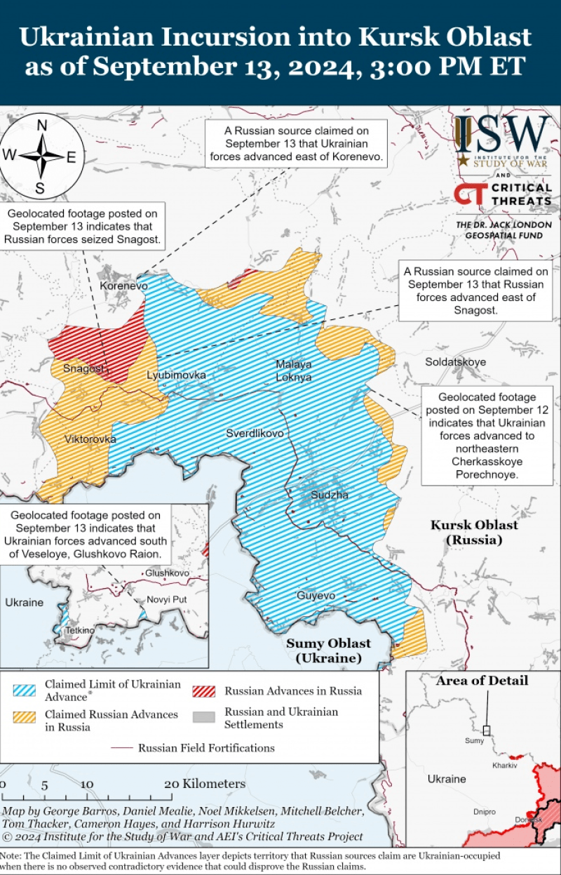 Геолокаційні кадри, опубліковані 13 вересня, вказують на те, що українські сили нещодавно просунулися на південь від Веселого (на південний захід від Глушково і за три кілометри від кордону).