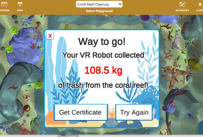 Змагання VEXcode VR Cleanup Challenge орієнтовані на дітей від 8 до 14 років. Юні програмісти повинні будуть успішно пройти місію «Coral Reef Cleanup/Очищення коралового рифу» - у спеціальному симуляторі запрограмувати віртуального робота, який прибере дно океану.
