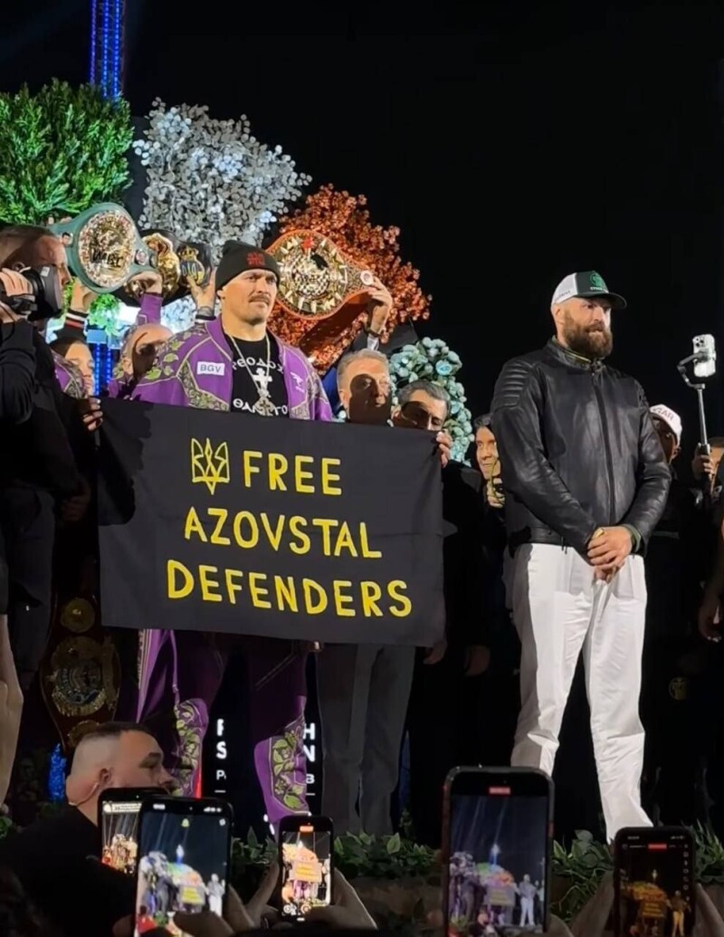 Під час свого виходу український боксер розгорнув на камери прапор, на якому англійською було написано Free Azovstal Defenders (звільніть захисників Азовсталі), пише NV.ua. Потім під час самої церемонії зважування Олександр знову розгорнув прапор.