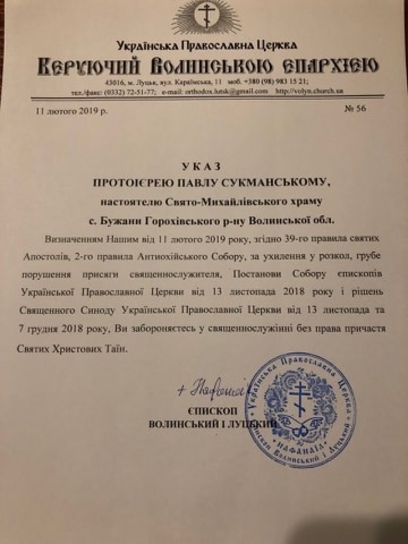 Цього разу покарали настоятеля храму в селі Бужани Горохівського району Павла Сукманського. Про це йдеться у указі єпископа Волинського і Луцького УПЦ МП Нафанаїла.