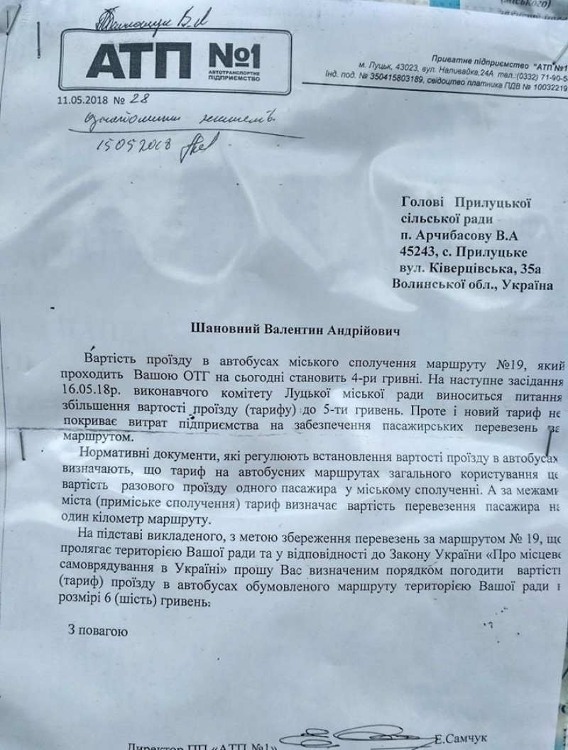 Про це ідеться у листі, який приватне підприємство «АТП №1» надіслало сільському голові Прилуцького Валентинові Арчибасову. Лист оприлюднила Марія Кеда на сторінці «Прилуцька громада» у Facebook.