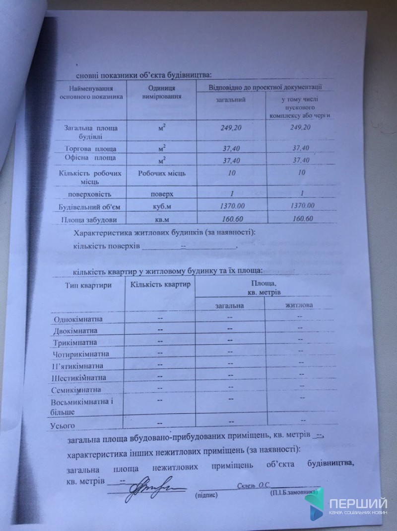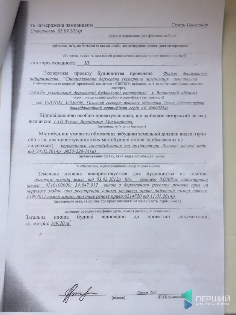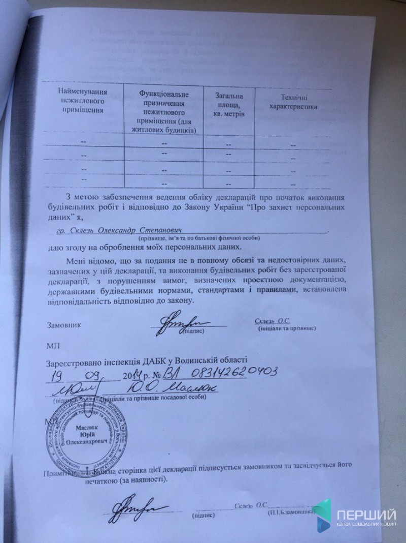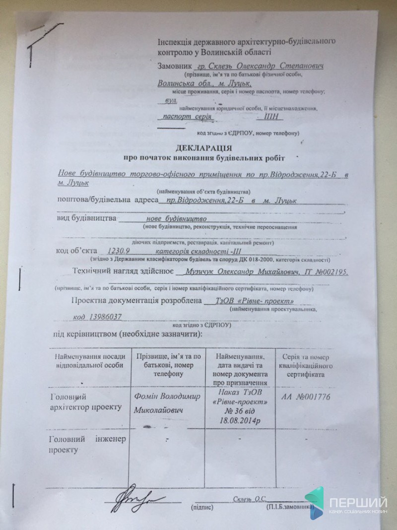 У відділі державного архітектурно-будівельного контролю Луцької міської ради «Першому» надали копію декларації про виконання будівельних робіт по Відродженню 22-Б.