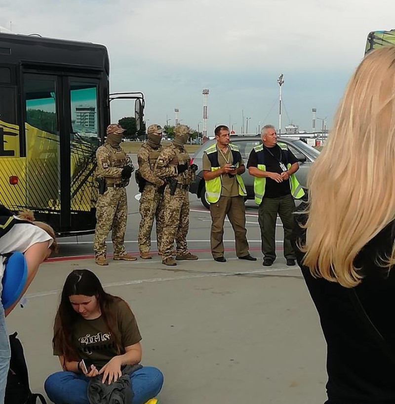 Зрештою, людей протримали на злітній смузі у спеку і вітер в оточенні невідомих людей у екіпіровці.