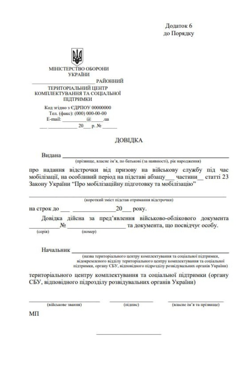 У військово-облікових документах чоловіків, які мають відстрочку від призову чи виключені з військового обліку за станом здоров’я, повинна бути інформація про отримання такої відстрочки чи виключення з військового обліку або довідка за формою, визначеною у додатку 6 Порядку проведення призову громадян на військову службу під час мобілізації, на особливий період, затвердженого постановою Кабінету Міністрів України від 16 травня 2024 №560.