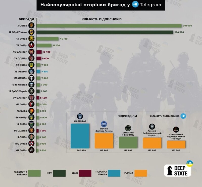 Ця інфографіка демонструє топ-20 українських бригад за числом підписників у Телеграм. Існує два лідера — 3 ОШБр та 12 БрСП "Азов". Медійку 47 та 72 ОМБр також можна назвати лідерською. Решта бригад має 10000 підписників та менше. До ТОП-20 також потрапили волинські 14 омбр і 100 омбр. Вони відповідно на 16-му та 19-му місцях.
