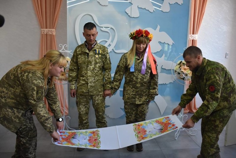 Як і на справжньому весіллі, були квіти, обручки, щирі вітання від найближчих друзів і побратимів, щасливі посмішки, і перший поцілунок молодих у якості подружжя. А от без весільного бенкету обійшлося, бо одразу після церемонії одруження молодята повернулися до виконання своїх службових обов’язків.