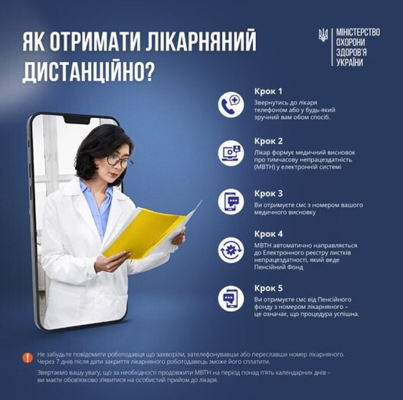 Міністерство охорони здоров'я України нагадує, що українці мають можливість залишатися вдома за наявності симптомів COVID-19, грипу або ГРВІ і звернутися до лікаря для оформлення лікарняного дистанційно.
