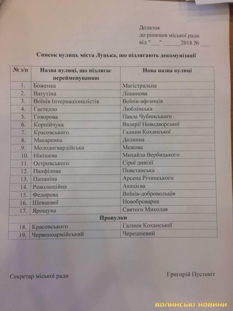 У Луцьку планують перейменувати 17 вулиць і 2 провулки. Проект рішення про це розглянуть на найближчій сесії Луцькради.