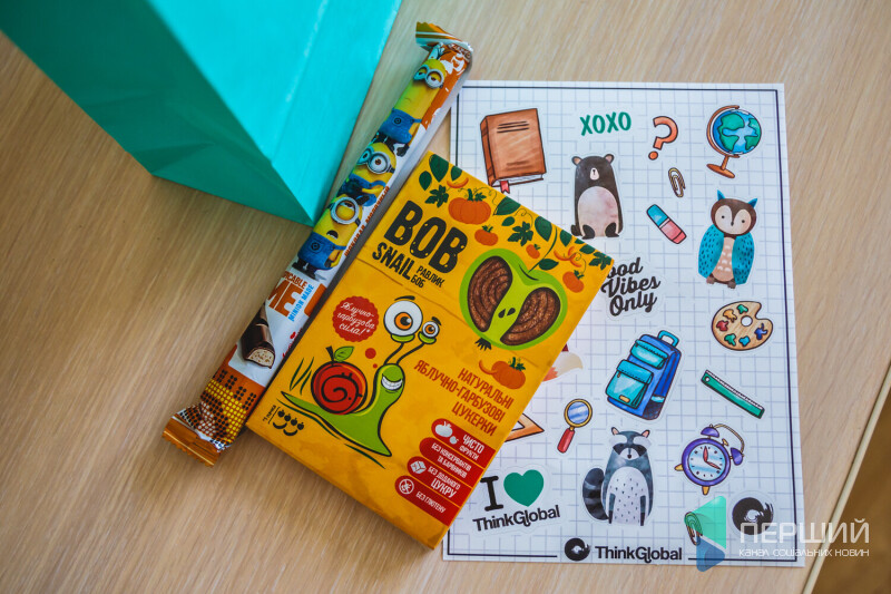 «Я все люблю», – каже хлопчик, перевіряючи, що цікавого є у бірюзовому пакеті. А там наклейки, смаколики та значок «ThinkGlobal». Те що треба!