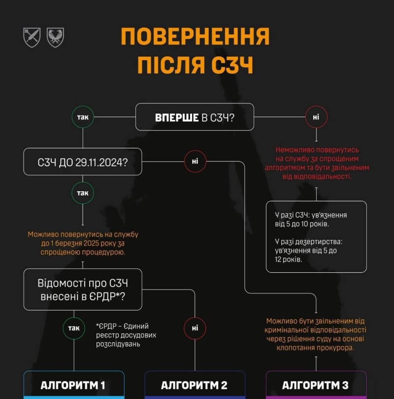 Там нагадують, що в листопаді 2024 року була ухвалена спрощена процедура повернення до служби військових та звільнення їх від кримінальної відповідальності, «якщо вони під час дії воєнного стану вперше вчинили СЗЧ чи дезертирство до 29 листопада 2024 року, і добровільно висловили бажання повернутись до військової служби до 01 березня 2025 року».