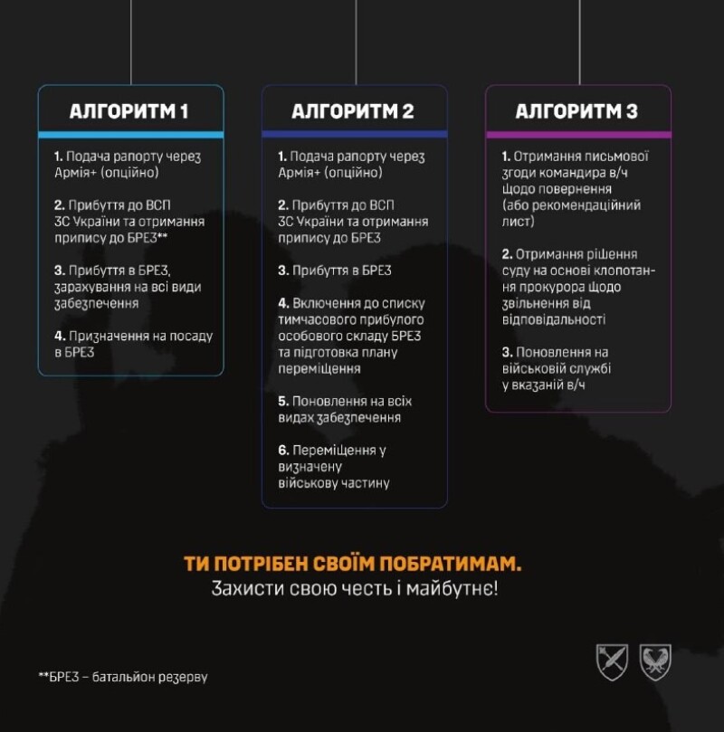 Подивіться, яка ситуація відповідає вашій чи, можливо, ваших знайомих. І просто дотримуйтеся інструкції. Додатково кожен із кроків в усіх деталях описаний в розділі сайту «Турбота про військовослужбовця» під назвою «Повернення після СЗЧ», – йдеться в коментарі.