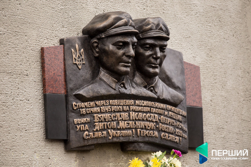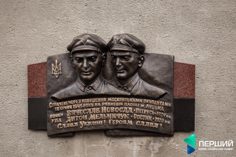 На дошці зображені два воїни УПА В'ячеслав Новосад та Антон Мельничук, яких 18 січня 1945 року на ринковій площі міста Луцька стратили через повішення московські окупанти.