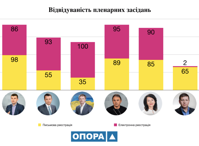 За електронною реєстрацією найвищий показник відвідуваності пленарних засідань у народного депутата Степана Івахіва – 100%. Друга сходинка знову ж таки у Ігоря Лапіна – 95%. На третій позиції нардеп Сергій Мартиняк із показником відвідуваності 93%. Представники 19-го та 23-го виборчих округів у парламенті Ірина Констанкевич та Ігор Гузь відвідали 90% та 86% засідань парламенту відповідно. «Пасе задніх» за показником відвідуваності списочник Юрій Савчук, який був зареєстрований лише під час 2% засідань ВРУ.