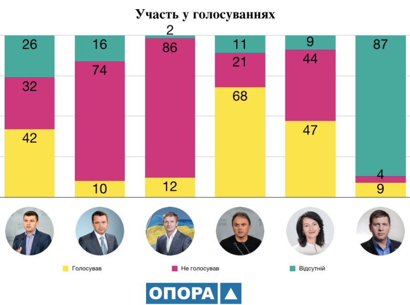 Щодо фізичної присутності під час голосувань, то найменше був відсутнім нардеп Степан Івахів – під час 2% голосувань, Ірина Констанкевич – під час 9% голосувань, Ігор Лапін – 11%, Сергій Мартиняк – 16% та Ігор Гузь – 26%.