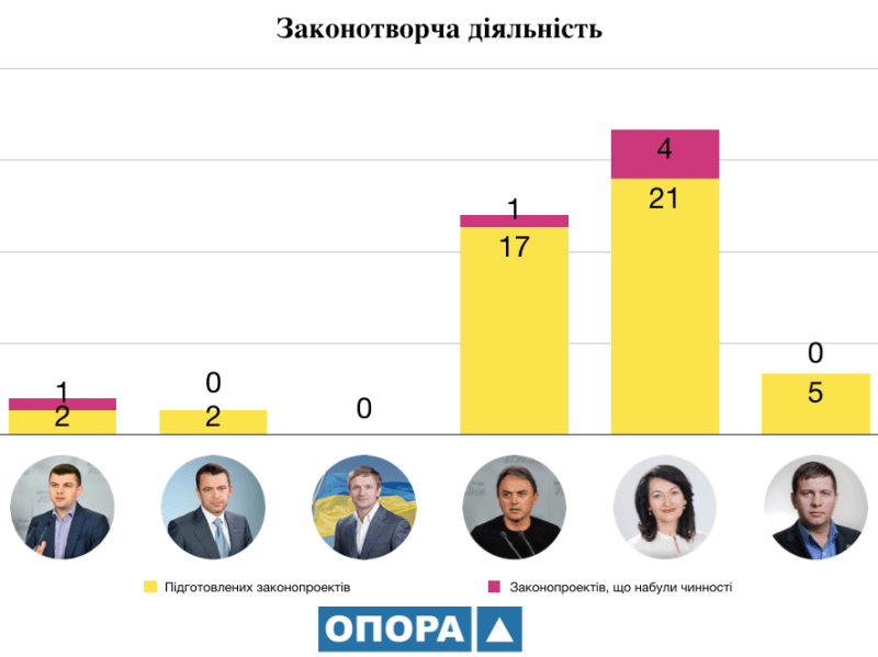 Найбільшу кількість законопроектів та проектів постанов підготувала за участю інших нардепів Ірина Констанкевич – 21. Ігор Лапін долучився до напрацювання 17 законодавчих ініціатив. По два законопроекти за період 9-ї сесії на рахунку нардепів Ігоря Гузя та Сергія Мартиняка. Натомість, народний депутат Степан Івахів не напрацював жодного.