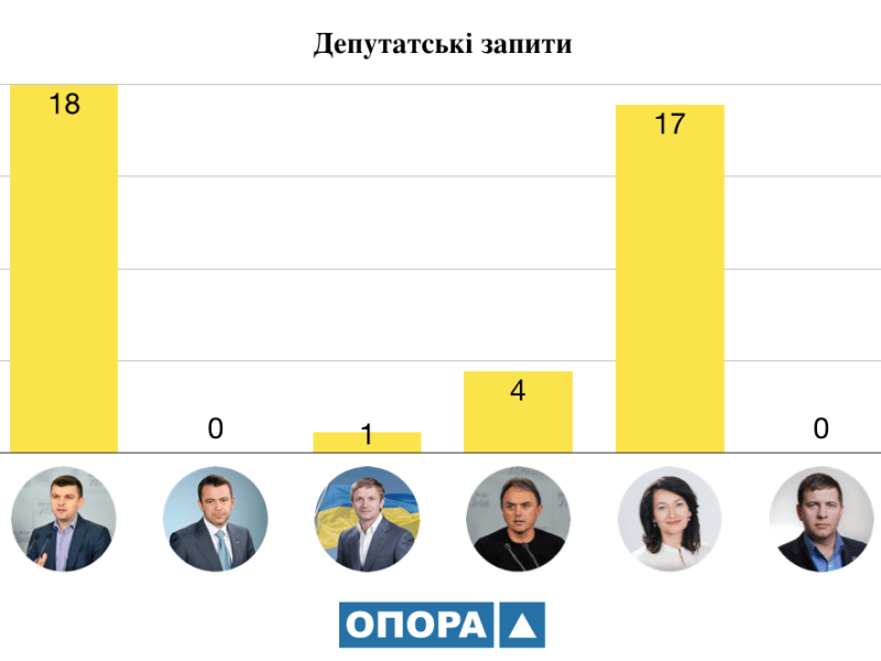Найбільшу кількість з них підготували народні депутати, які представляють у Раді округи № 19 та № 23, Ігор Гузь та Ірина Констанкевич. На їх рахунку 18 та 17 унікальних запитів відповідно. Представник виборчого округу № 22 Ігор Лапін за цей же період подав 4 унікальні запити, один з яких було направлено одразу 22 суб'єктам (переважно місцевим органам влади та установам). Степан Івахів, який обирався у виборчому окрузі № 21, підготував лише один депутатський запит. Натомість, на рахунку Сергія Мартиняка (ОВО № 20) – жодного запиту.
