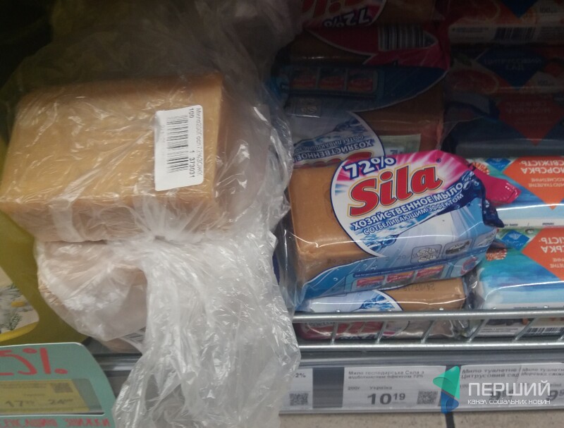 Господарське мило – у поліетилені. Здається, хтось нашвидкуруч порозкидав його у кульки і вивантажив на нижню полку, щоб ніхто його там не побачив.