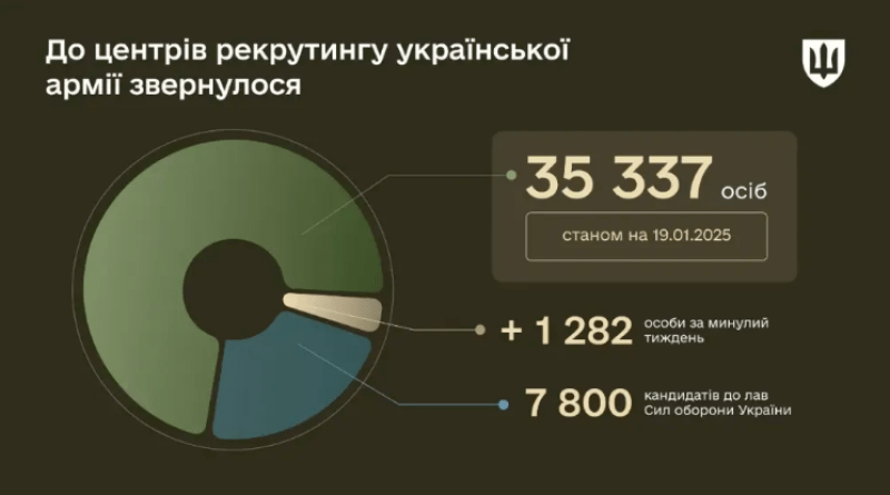 Протягом минулого тижня до центрів рекрутингу української армії звернулось 1 282 особи. Загалом з початку роботи центрів загальна кількість відвідувачів сягнула 35 337, з яких 7 800 з них вже стали кандидатами до лав Сил оборони України.