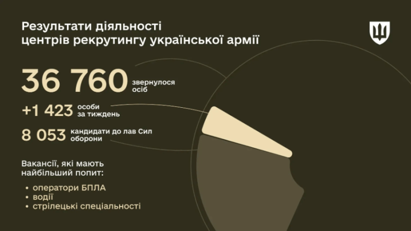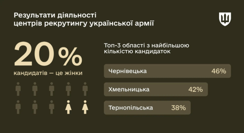 З початку роботи центрів рекрутингу української армії 36 760 громадян отримали консультації щодо вступу на військову службу. 8 053 з них вже стали кандидатами до Сил оборони, 20% з яких – жінки.