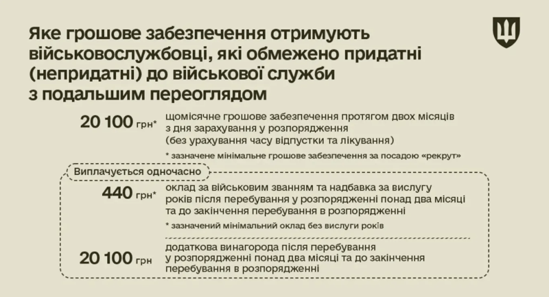 Також пораненим військовослужбовцям, які визнані ВЛК обмежено придатними до військової служби або непридатними з переоглядом через 6-12 місяців та зараховані у розпорядження відповідних командирів, протягом двох місяців з дня зарахування у розпорядження (без врахування часу перебування у відпустці та на лікуванні) виплачується грошове забезпечення (без урахування додаткової винагороди) за останньою займаною посадою в повному обсязі (далі – двомісячний період).