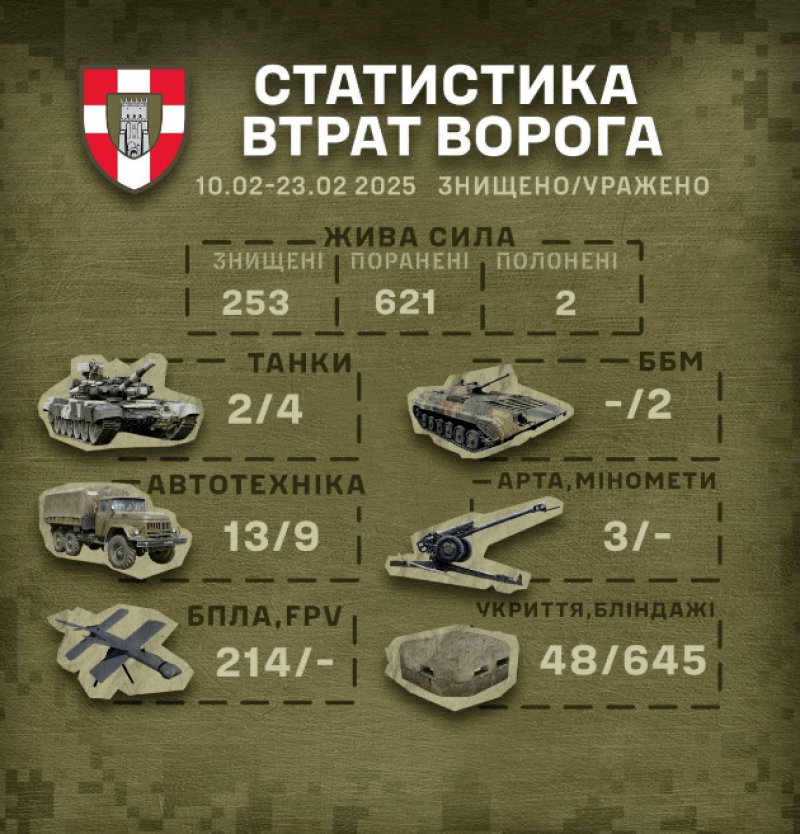 Бійці 100-ї окремої механізованої бригади завдали значних втрат ворогу у період з 10 по 23 лютого 2025 року.